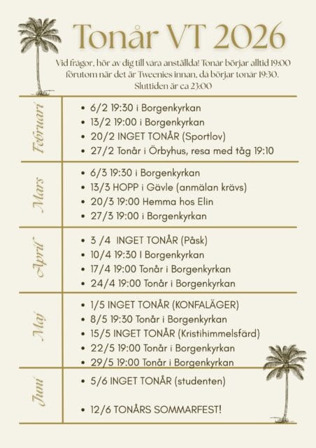 På Tonår får du komma som du är och hänga i go gemenskap där vi hittar på olika aktiviteter varje gång. Terminens program finns här nedanför.