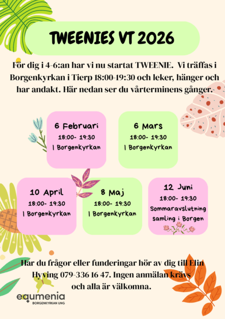 Vi träffas i Borgenkyrkan i Tierp 18:00-19:30 och leker, hänger och har andakt.